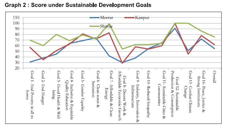 Sustainable growth and development indicators have emerged as the barometers of performance and public perception. NITI Aayog recently came out with the ranking of the municipal corporations based on defined parameters aggregated into 16 goals. Meerut with an overall score of less than 60 was a performer and not a front runner. In two crucial parameters of End Poverty and Decent Work and Affordable growth, the score of Meerut was just close to 30, which is subpar from any consideration. In terms of Multi Poverty Index developed by NITI Aayog also, the head count ratio of poverty was 21.1 per cent, though lower than the national average of 25 per cent was much above the ratio observed for Punjab, Himachal Pradesh, Tamil Nadu, which was under 10 per cent. Performance of the Municipal Corporation in terms of parameters relating to health and education was also poor. While it performed better in sustainable production and consumption and civic amenities relating to water supply and sanitation, overall performance had significant incremental improvement scope. Better SDG score, which in a way is a surrogate measure of effectiveness of implementation and better outcome, could provide the benefits of agglomeration and higher scale of urbanization. It could also help the district to benefit from urban Meerut. Overall Goal based score and the score of Best Corporation is in graph below.