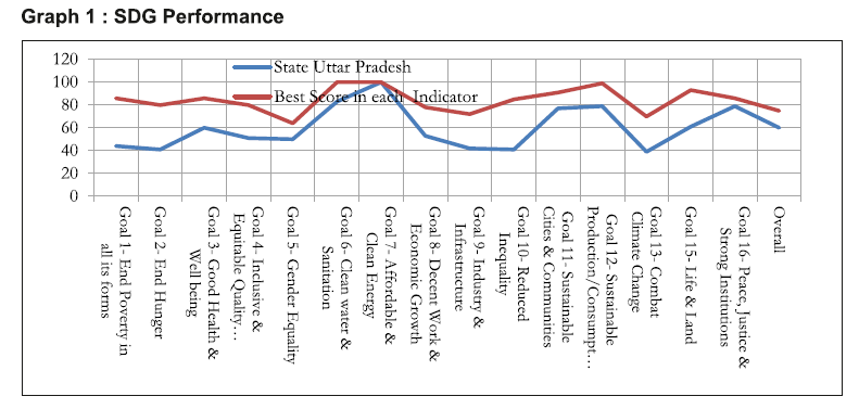 The Sustainable Development Goals (SDGs) has emerged as ambitious commitments and a new paradigm for development. The SDGs are a bold universal set of 17 Goals to help organise development actions for overall human wellbeing, while leaving no one behind. The SDGs are in a way commitments and goalposts to be achieved over a time frame of 15 years by 2030, with implementation strategy and achievements staggered over a time frame of three, seven and fifteen years. The spectrum of the 17 SDGs ranges from poverty eradication, human health and sanitation to urban settlements and to safeguarding the ecosystems necessary for our survival. SDG Index 3, ranks States/UTs based on their performance across the 16 SDGs and is a useful instrument to judge the progress of the States/UTs in adopting and implementing the SDG agenda, the new development paradigm. The data sources for the selected indicators have been restricted to national survey reports/national data portals/MIS portals of Union ministries. Overall performance of Uttar Pradesh with an Index value of 60 is only of a performer, way behind the States which are front runners (Graph 1). While this indicates below par performance base, it also gives optimism that performance can be significantly scaled up.